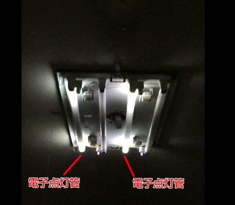 向かって左端と右から2番目の蛍光灯が電子点灯管を使用しています。